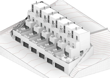 The land has a pronounced slope morphology with its axis oriented northwest. The maximum height difference between the highest point and the lowest point is 9-10m. This implies an average slope of 48% or 25-26 °. The solution adopted was to subdivide the original land into 6 plots to accommodate 6 houses. Due to the steep slope between the two streets in the longitudinal axis of the plot, the proposed solution has several levels, trying to save this pronounced level difference. Since both streets have a steep slope, it has been chosen to reshuffle the housing volumes for better grounding. Access, both pedestrian and road, is independent for every home, so there is no element in common. All homes have double pedestrian access. Vehicle access takes place only on lower level street.